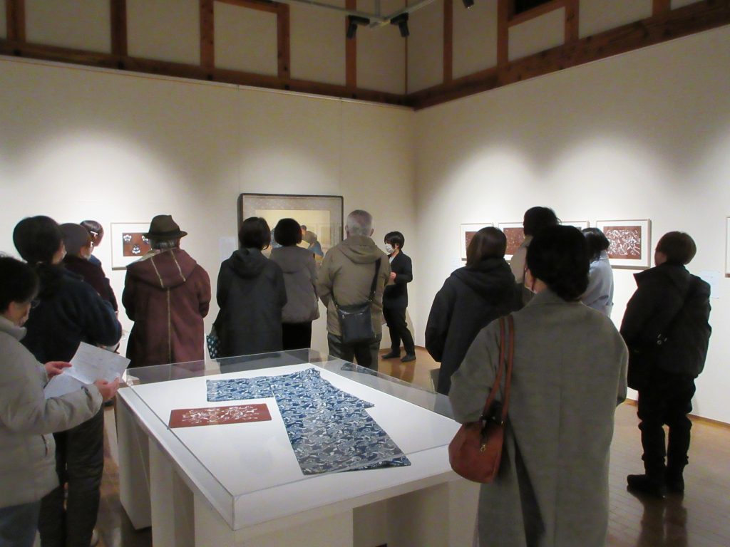 市文化課学芸員が型紙や資料を通して、会津型の歴史や染物が出来上がるまでの過程を紹介しました。また会津型の図柄に合わせ、当館学芸員が所蔵作品の解説を行いました。皆さん、興味深く耳を傾けていました。